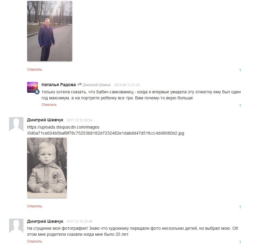 Проте не все так просто: є й інші претенденти називатися «обличчям згущенки». На сайті bessarabiainform.com у коментарях під публікацією про одесита Бабича дописав Дмитро Шевчук. Він заявив, що художнику передали фото кількох дітей, серед яких була і його світлина, котру й обрав художник. У якості доказів дописувач прикріпив до коментарів своє фото в дитинстві та у дорослому віці, і додав, що про це розповіли батьки, коли йому виповнилося 25 років.