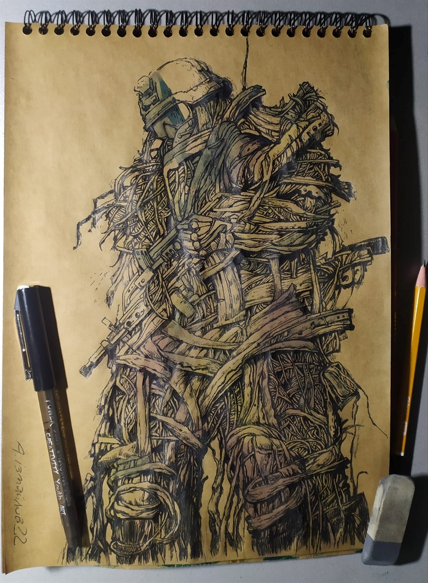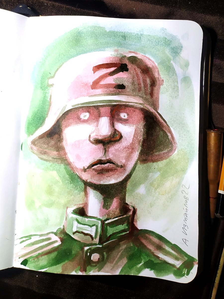 Цей малюнок, до речі, має цікаву долю. Мій товариш-байкер в теробороні якраз брав участь у бою з цим БТРом. Вони обстрілювали його. Він з кулемета стріляв з протилежного боку. А наші військові підбили з джавеліна, здається. БТР загорівся, орки вискочили і почали стріляти — і поранили мого друга. Він отримав 3 кулі: в живіт, стегно і в ногу. Саме на тому місці. Зараз він досі на лікуванні, але бадьорий такий, молодець. Так от, він попросив, щоб я йому цю картинку подарував. Звісно, я погодився. Приїде — подарую. Тож це картина з історією.