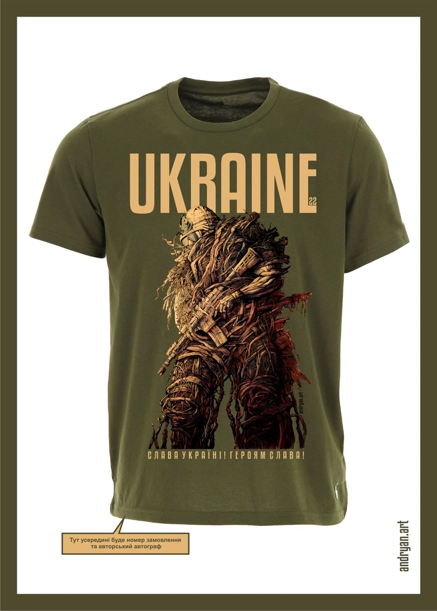— Це було натхнення. Я намалював спочатку ескіз — чорно-білий малюнок: образ України — напівзруйнований, але який міцно стоїть на ногах; з корінням, яке йде з землі; який міцно тримає зброю, незламний, сильний. І цю картинку відібрали модератори арт-групи у фейсбуці «Сіль-Соль». Там дуже жорсткий відбір, туди відбирають кращі роботи художників з усієї країни. І ця робота набрала неочікувано багато вподобань. Хтось написав: чекаю футболку з таким принтом. Я картинку допрацював, додав написи, змінив кольорову гамму. І знайшлось багато бажаючих її придбати. Відгукнулись люди з усієї країни. На сьогодні вже більше 70 бажаючих. В понеділок має прийти перша пробна футболка. Частину виручених коштів ми відправимо на потреби ЗСУ.