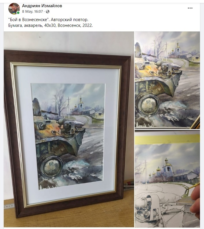 — Було одне. «Бій в Вознесенську» я повторив для нашої тероборони, вони захотіли придбати. Спеціально для них я намалював у більшому форматі, оформив в раму, паспарту — гарно.