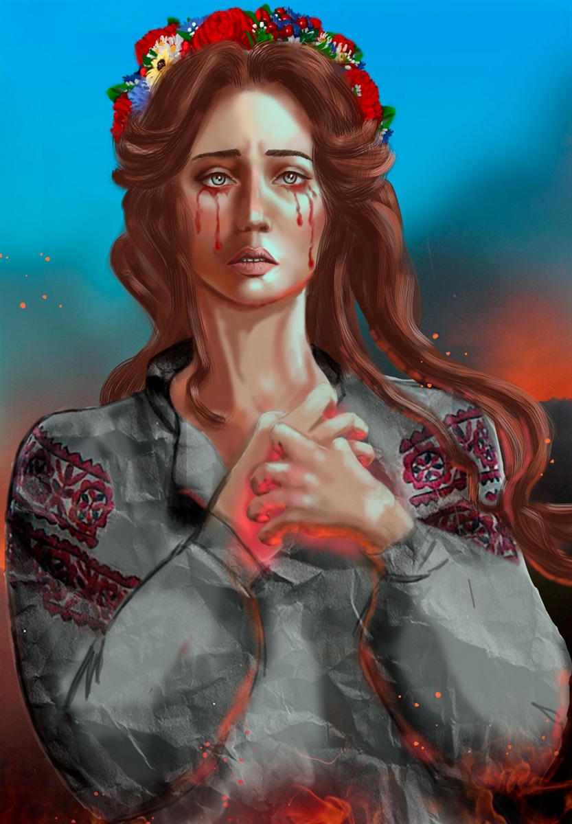 Патріотичний художник Андрій Синюк, до соц мереж якого ви можете долучитися за посиланням https://twitter.com/Andriy_Synuk, завершив нову роботу під назвою «Сльози України». Картина зображує пожежу в полі пшениці, яка, безумовно, символізує страждання і горе, принесені ворогами на наші землі. У центрі роботи - українська дівчина в національній вишиванці, з вінком на голові. Ми бачимо її переживання за долю українців. Дівчина немов плаче кривавими сльозами. Але блакитне небо над її головою говорить про те, що після темних часів війни настане мир. Дівчина – символ мільйонів українців, які шоковані жорсткістю окупантів та готові на все, щоб допомогти героям-захисникам на фронті. В її особі ми бачимо і волонтерів, і звичайних громадян, що працюють та сплачують податки в бюджет. Без таких, як ця дівчина, країна не зможе й далі вести війну та перемагати ворога на полі бою.