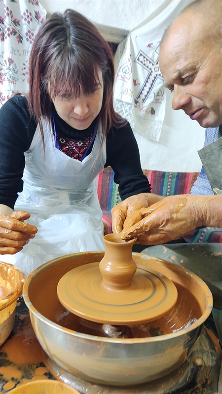 Насамкінець майстер запропонував і авторці цієї статті спробувати попрацювати з глиною. Відчуття захопливі, наче повертаєшся в дитинство. Обрати, що саме будеш ліпити: глечик чи вазочку, горщик чи миску. А потім спостерігати, як глина у руках змінює форму. Майстер показує, пояснює і допомагає, тож усім, навіть якщо доторкнувся до гончарного круга вперше, усе вдається.