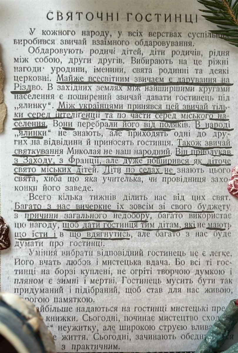 «Майже всесвітним звичаєм є дарування на Різдво. Між українцями принявся цей звичай тільки серед інтеліґенції та по части серед міського населення. Вони перебрали його від поляків. Також звичай святкування Миколая не наш народний. Він приблукав з Заходу, з Франції. Але дуже поширився як діточе свято міських дітей. Діти по селах не знають цього свята. ... Багато з нас вичеркне їх зовсім зі свого буджету з причини загального недобору. Багато використає цю нагоду, щоб дати гостинця тим дітам, які не мають що їсти і в що вдягнутись», – це рядки з газети Нова хата за 1927 рік. Це видання Львівського жіночо-промислового кооперативу, коротше кажучи, жіночий журнал на Галичині.
