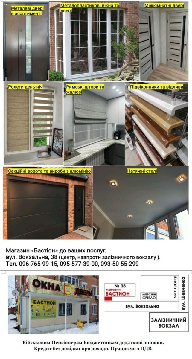 - Магазин «Бастіон» пропонує великий асортимент товарів. Металеві двері. Міжкімнатні двері. Металопластикові вікна, двері, балкони. Підвіконня та відливи. Ролети день-ніч. Римські штори. Горизонтальні та вертикальні жалюзі. Секційні ворота та вироби з алюмінію. Натяжні стелі. Фурнітура та багато іншого. За детальною інформацією звертайтеся до магазину або за телефонами: 0967659915, 0955773900, 0935055299, вул. Вокзальна, 38 (навпроти залізничного вокзалу).