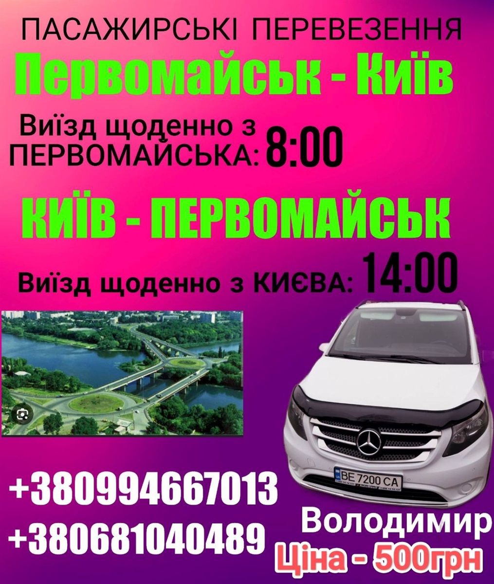 Пасажирські перевезення: Первомайськ – Київ — Первомайськ. Швидко. Зручно. Комфортно. Обирайте перевірену якість та комфорт: нові автомобілі Mercedes Benz Vito: сучасні, безпечні та максимально комфортні; великий досвід водіїв: професійність, надійність та впевненість у кожній поїздці. Дуже комфортно: просторі салони, зручні сидіння, ідеальний клімат. Рейси щодня. З Первомайська до Києва: 8:00, з Києва до Первомайська: 14:00. В дорозі 3 години. Ціна квитка: 500 грн. Забронюйте місце зараз. Телефонуйте: 0994667013, 0681040489, Володимир.
