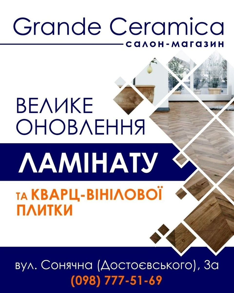 - У Grande Ceramica — велике оновлення! Нові колекції ламінату та кварц-вінілової плитки вже чекають на вас. Стильні рішення для вашого інтер’єру, які поєднують красу та практичність. вул. Сонячна (Достоєвського). Зв.: 0987775169.