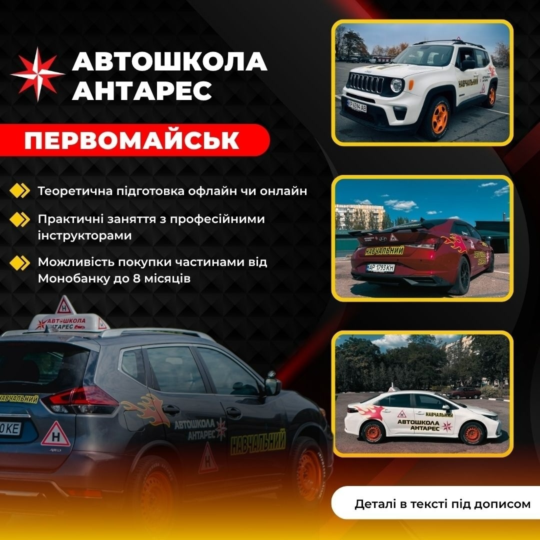 - Автошкола Антарес наразі налічує майже 100 фізичних філій в різних куточках країни. Антарес має власний автопарк, в якому присутні авто різних марок: Hyundai, Nissan, Toyota, Skoda, Kia, Jeep, Tesla та інші. У місті Первомайськ ми запрошуємо вас за адресою: вул. Грушевського, 41. Є розстрочка до 8 місяців через Монобанк — без переплат. Дізнавайтесь усі деталі у чат-боті: https://t.me/AvtoshkolaAntares_bot?start=tgpublic. Більше інформації за посиланням.