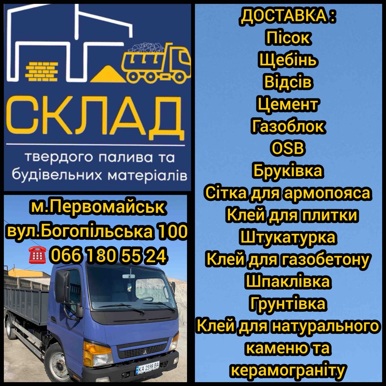 - На складі будівельних матеріалів ви можете придбати: пісок, відсів, щебінь, цемент М500, відсівоблок, газоблок, вапняну пасту, шпаклівку (Туреччина), клей для плитки, керамограніту, газобетону, сітку металеву кладочну, грунтівку універсальну, ОSB 9 мм. Крім того, ми пропонуємо: Доставку (авто з різними габаритами, вантажопідйомністю від 1 т до 25 т). Будь-яку форму розрахунку. Працюємо з ПДВ. Швидке оформлення замовлення. Залишилися питання або бажаєте оформити замовлення, телефонуйте за номерами: 0661805524, Ірина; 0985684156. Адреса: м. Первомайськ, вул. Богопільська, 92.