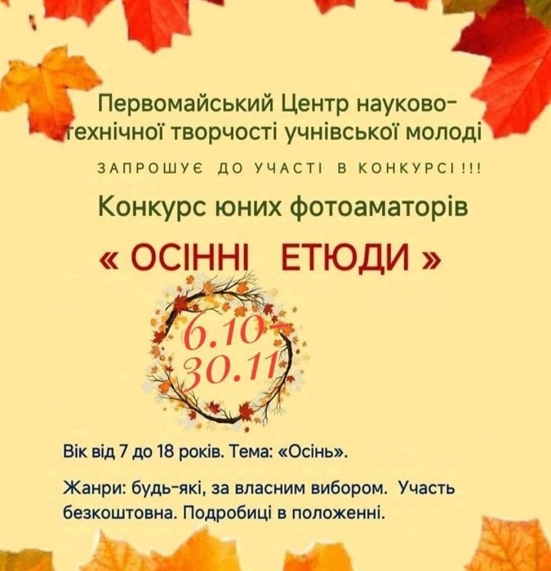 Первомайський центр науково-технічної творчості учнівської молоді оголошує конкурс «Осінні етюди» для юних фотоаматорів віком від 7 до 18 років. Як взяти участь, читайте на Гард.City.