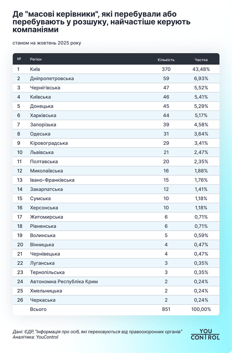 Станом на жовтень 2025 року в Україні нараховується 40 фізосіб, ПІБ яких співпадає з особами, які перебувають або перебували в розшуку та очолюють понад 10 компаній. Сукупно ці особи керують 851 компанією. Майже половина «масових керівників», які перебували чи перебувають у розшуку, очолюють підприємства у Києві, решта найбільших за кількістю юросіб припадає на Дніпропетровську, Чернігівську, Київську та Донецьку області. Третина компаній працюють у сфері оптової торгівлі. Детальніше — у новому дослідженні YouControl.
