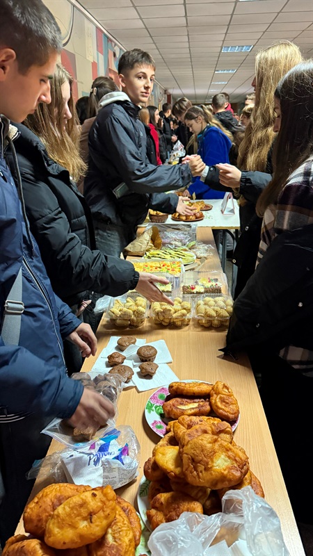 У фоє коледжу гамірно, грає музика, студенти наперебій продають і купують смаколики, а на столах таке розмаїття страв, що очі розбігаються.