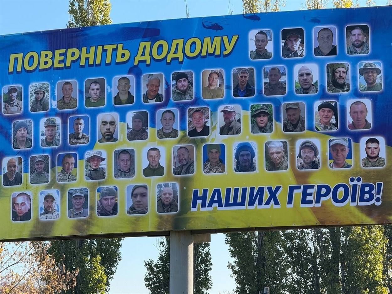У неділю, 2 листопада, поблизу великого борда на мостах, як їхати до вулиці Грушевського, зібралися рідні полонених і зниклих безвісти. На цьому борді — портрети їхніх близьких. Історії, що стоять за кожною світлиною, — це біль, тривале очікування й надія.