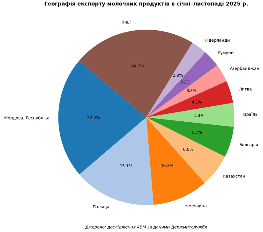 У січні-листопаді 2025-го найбільшими споживачами української молочної продукції стали Молдова, Польща та Німеччина. Зокрема, до Молдови вирушило 91% незгущеного молока та вершків, 84% кисломолочних продуктів, 30% масла і 34% сирів. Польща залишалася основним імпортером згущеного молока (18%), сироватки (35%) та казеїну (47%), а до Німеччини було експортовано 29% морозива.