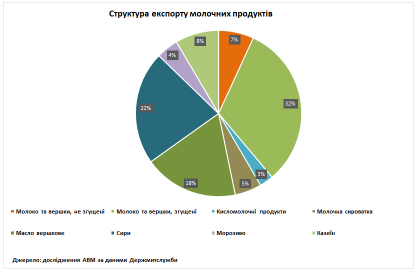 Найбільше у листопаді зросли обсяги експорту згущеного молока та вершків — до 3,63 тис. тонн (+82%). Також збільшилися відвантаження масла (+4%), казеїну (+6%) та незгущених молока і вершків (+3%). Натомість експорт кисломолочних продуктів скоротився на 17%, сирів — на 10%, морозива — на 9%, сироватки — на 2%.