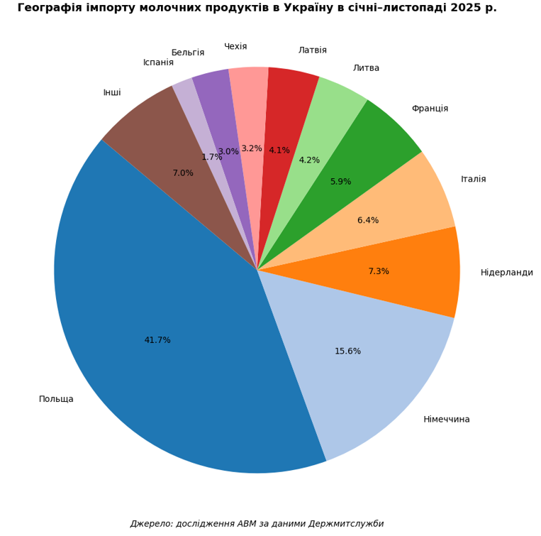 У листопаді 2025 року Україна імпортувала 5,55 тис. тонн молочних продуктів на 30,91 млн доларів. Це на 6% менше, ніж у жовтні. За 11 місяців імпорт зріс на 10% у фізичних обсягах і на 20% у грошовому. Основну частку становили сири — 64%, більшість яких надійшли з Польщі.