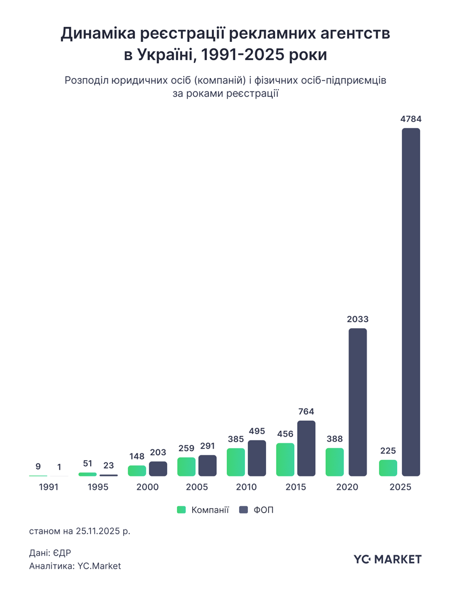 Структура реєстрацій демонструє стабільну тенденцію: переважна більшість нових рекламних агентств створюються у форматі ФОП, що природно для ринку з низьким порогом входу, проєктною роботою та високою часткою фриланс-команд. Юридичні особи формуються рідше, але працюють значно стабільніше.