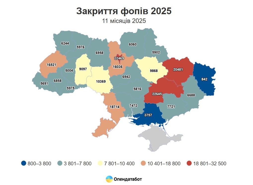 Для порівняння, Одещина втратила 18 714 ФОПів, а Херсонщина, де ситуація з безпекою залишається критичною, — 3 757. Лідером за кількістю закриттів залишається Київ (понад 32 тисячі).