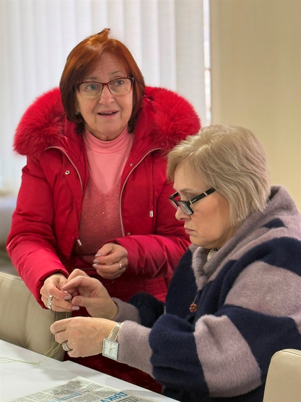 Майстриня ж показувала, допомагала та розповідала, де замовляє матеріали та якими користується інструментами. Робота кипіла, атмосфера панувала тепла, а тим часом і радіатори швидко нагрілися, і в чайнику під саморобною грілкою, виготовленою однією з майстринь, заварювався чай для спільного чаювання.