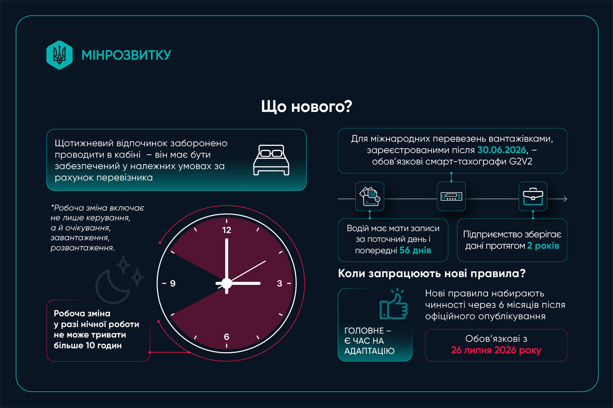 Міністерство розвитку громад та територій України впроваджує оновлені правила для водіїв, що здійснюють внутрішні та міжнародні перевезення. Мета змін — гармонізація українського законодавства із нормами Європейського Союзу, підвищення безпеки на дорогах та покращення умов праці.