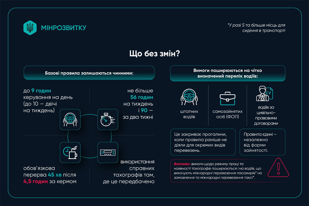 Відтепер Україна офіційно застосовуватиме вимоги Регламенту (ЄС) № 561/2006. Основні зміни стосуються наступних аспектів: