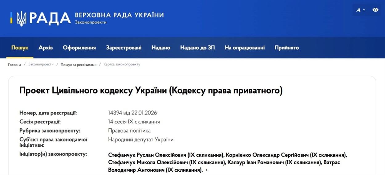 Парламентом дійсно зареєстрований проєкт нового Цивільного кодексу України (№14394), що пропонується під назвою «Цивільний кодекс України (Кодекс права приватного)». Дата реєстрації 22 січня 2026 року. Як видно з картки законопроєкту, його автором є спікер парламенту Руслан Стефанчук та ще низка нардепів.