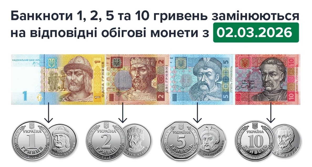З 2 березня 2026 року банкноти номіналами 1, 2, 5 та 10 гривень зразків 2003-2007 років повністю замінять на відповідні обігові монети. Від цієї дати купюри будуть поступово вилучати з обігу з огляду на їхню зношеність. Нові натомість не виготовлятимуть: дрібні гривневі номінали ходитимуть лише у вигляді монет.