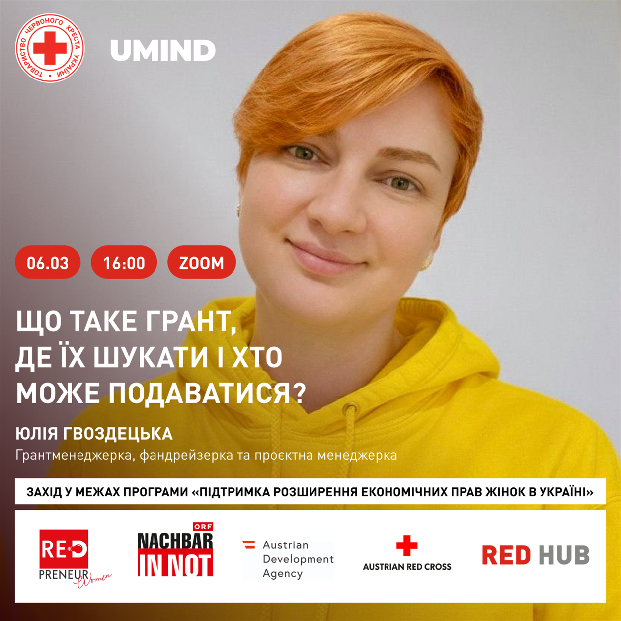 Український Червоний Хрест у партнерстві з UMIND запрошують охочих на онлайн-захід у межах програми «Підтримка розширення економічних прав жінок в Україні» на тему «Що таке грант, де їх шукати і хто може подаватися?». Як взяти участь, читайте на Гард.City.