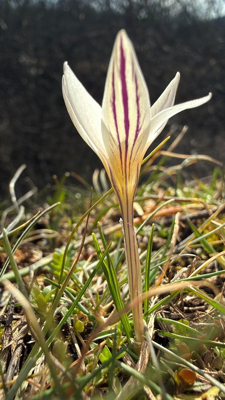 А вище на схилах, де тепліше, подалі від цікавих очей причаїлися червонокнижні первоцвіти Гарду. Ця квітка зветься шафран сітчастий (Crocus reticulatus).