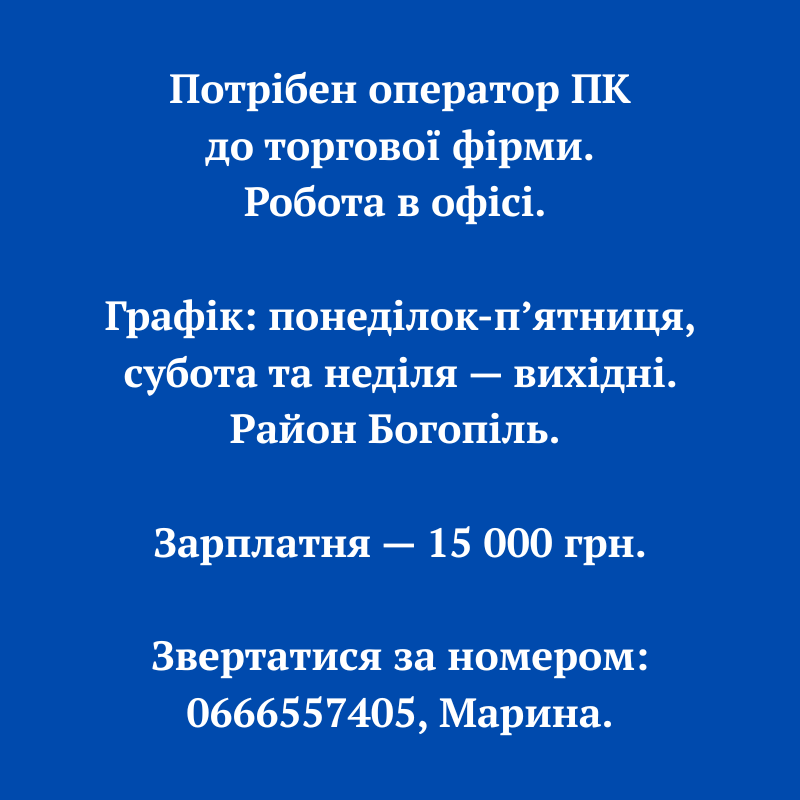 - Потрібен оператор ПК до торгової фірми. Робота в офісі. Графік: понеділок-пʼятниця, субота та неділя — вихідні. Район Богопіль. Зарплатня — 15 000 грн. Звертатися за номером: 0666557405, Марина.