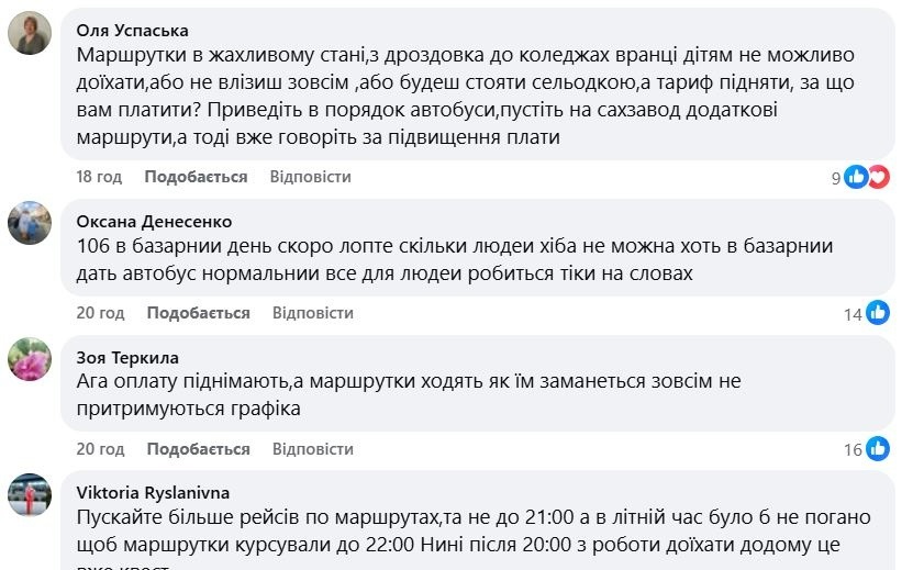 Водночас первомайці активно обговорюють тему перевезень у соцмережах після засідання комісії. Частина містян наголошує, що підвищення тарифу може вдарити по сімейних бюджетах, адже доходи залишаються низькими. Водночас найбільше нарікань стосується не вартості, а якості послуг. Люди скаржаться на недотримання графіків, переповнені та технічно зношені автобуси. Зокрема, у коментарях пишуть: «А як стосовно дотримання розкладу? Пропуск маршрутів?», «Маршрутки ходять як їм заманеться — зовсім не притримуються графіка», «Маршрутки в жахливому стані, люди тисняться». Також містяни звертають увагу на проблеми з доїздом у вечірній час і на окремі напрямки, де, за їхніми словами, не вистачає рейсів.