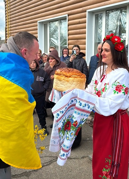І от земляка вітають з поверненням: лунає музика, до хмар летить кольоровий дим: жовтий та синій.