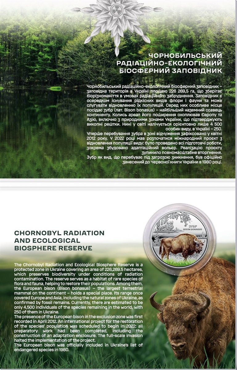 Національний банк України оголосив про введення в обіг нової пам’ятної монети «Чорнобиль. Відродження. Зубр». Ця монета завершує знаковий цикл, присвячений флорі та фауні Чорнобильського радіаційно-екологічного біосферного заповідника.
